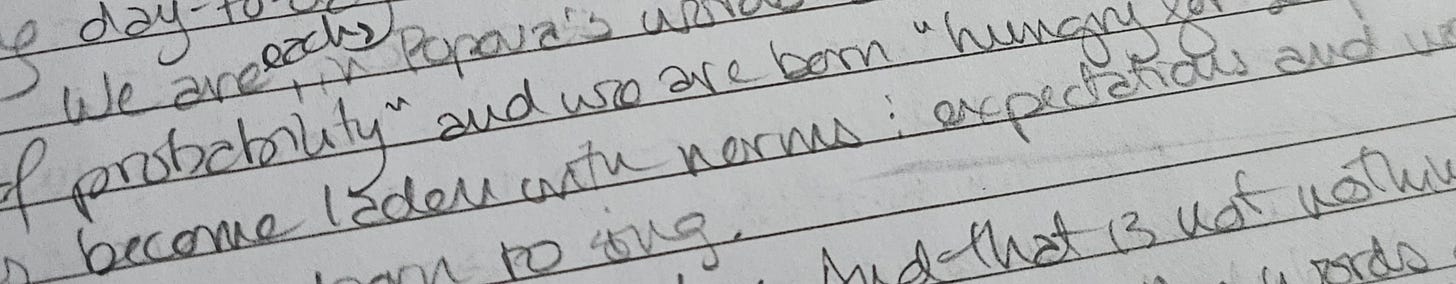 We are, each, in Popova’s words “a silent note in the mouth of probability” and we are born “hungry for song”. But our lives become laden with those exact probabilities, those norms and expectations, and we forget we were born to sing.