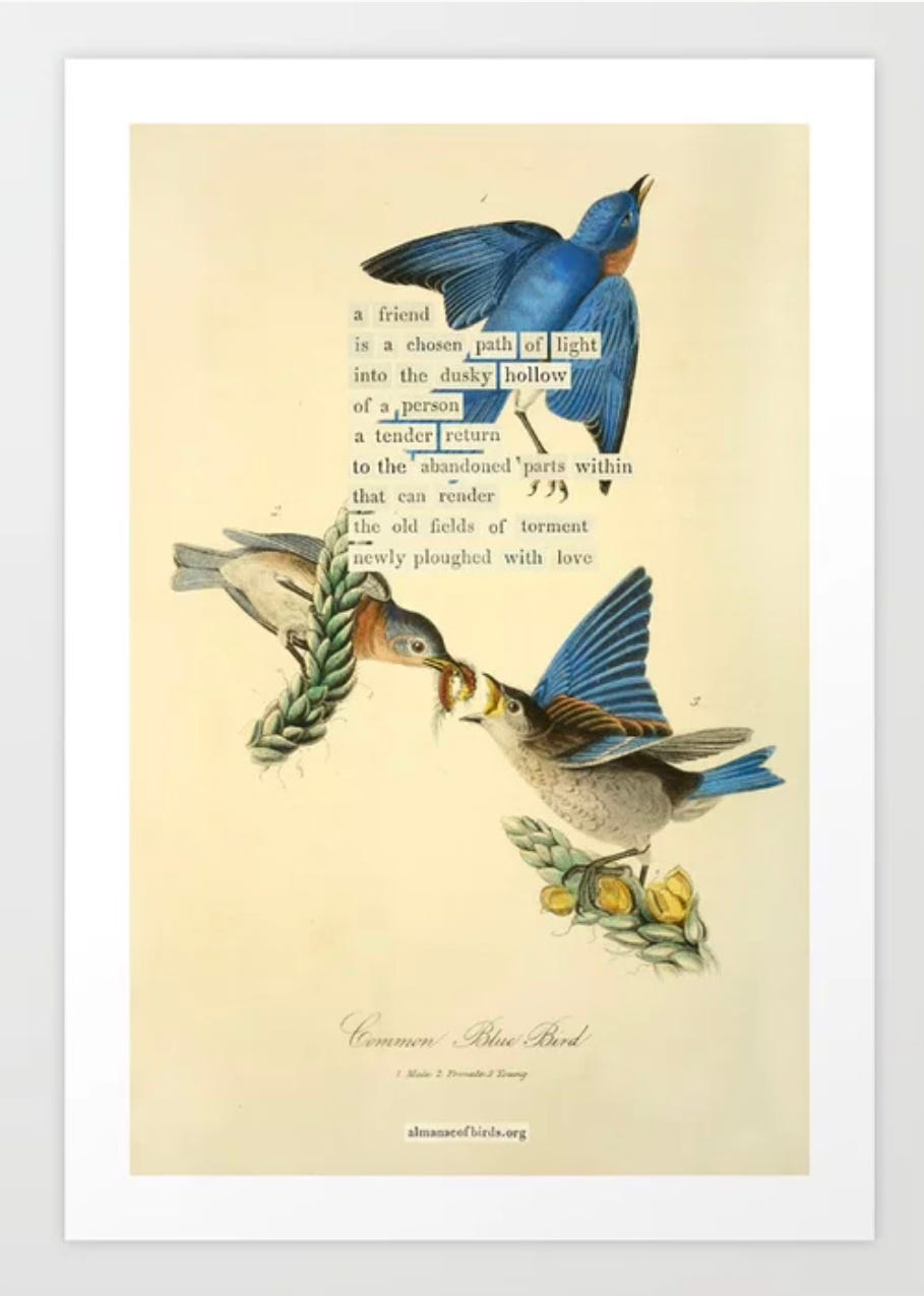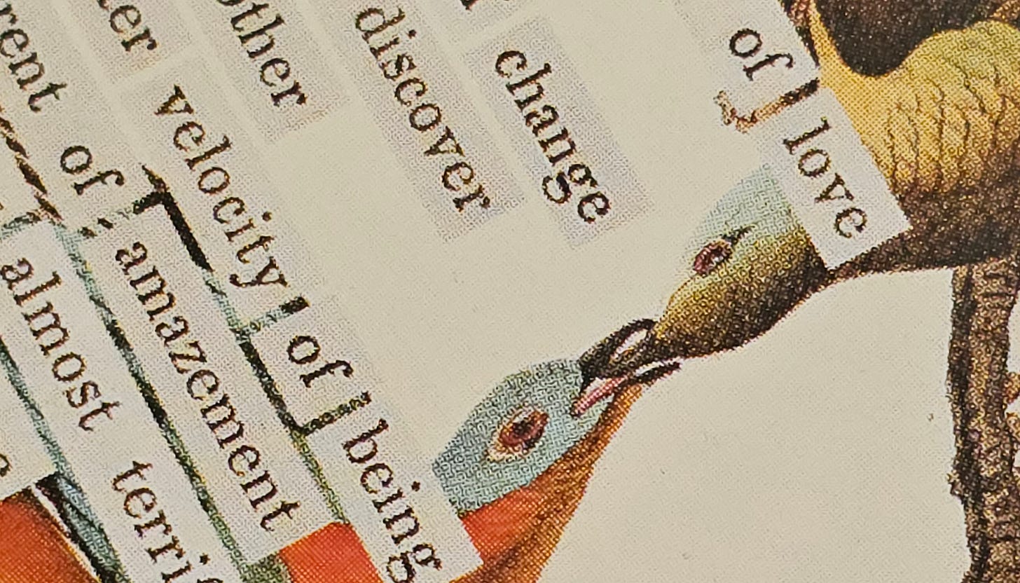 I’m hoping to share these with you with some regularity. At this point, I’m not sure if it will be through a simple Note on Substack or an entire post. I’m thinking a post but will do the research first to see which is most likely to find you. I’ll protect Popova’s work by not sharing the photos of her divinations unless they are available elsewhere online (as is the one above) or am informed it is legal for me to do so. If the photo isn’t available, I’ll include the inspired text she created from Audubon’s image should it be confirmed that I have the right to do so. That email has been sent and I await the reply from the publisher. If there is nothing I can legally share but the public domain Audubon image, I’ll post that.